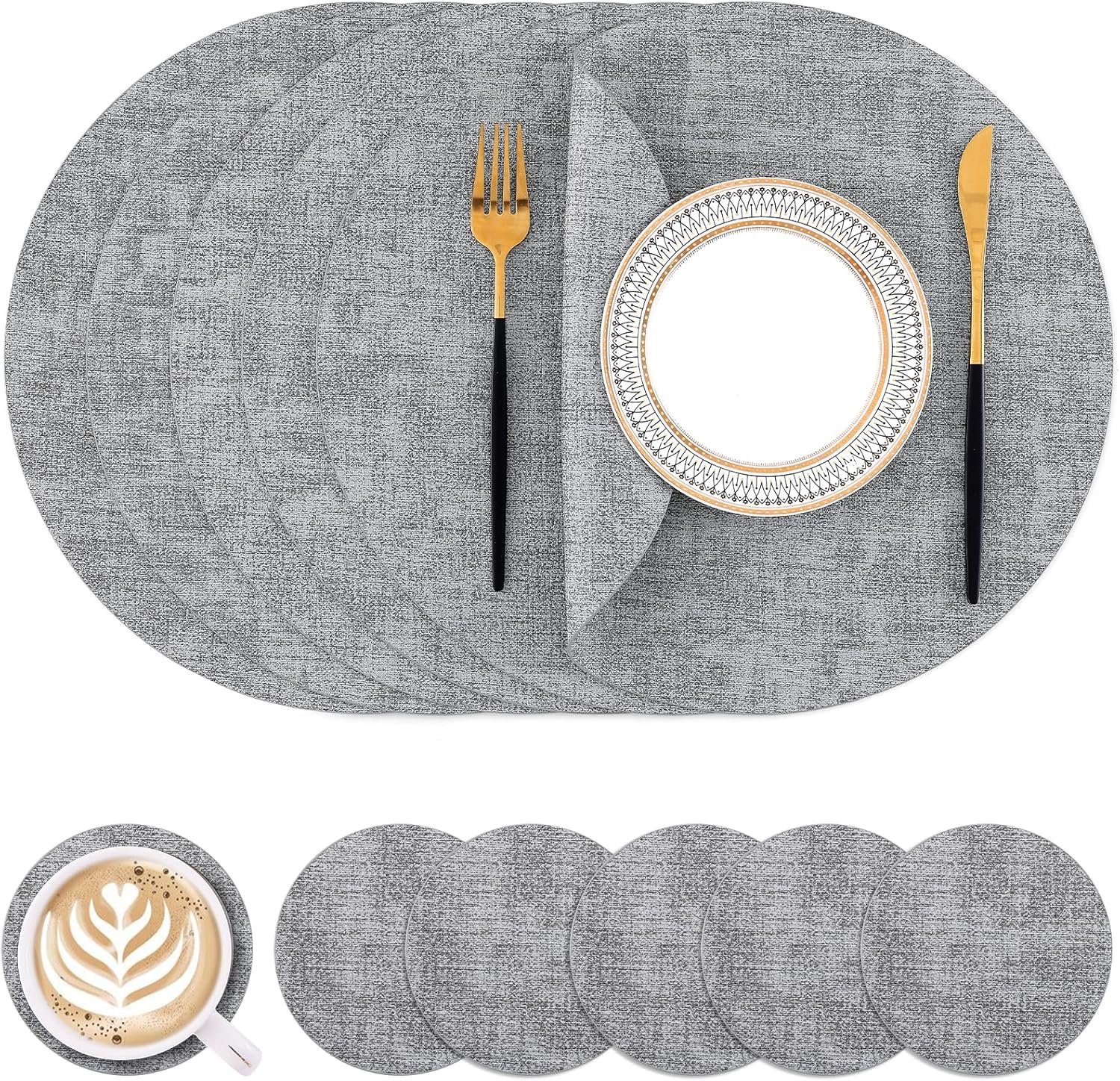 这款圆形人造革餐垫与杯垫套装专为日常用餐设计,采用高品质人造革材质,双面亚麻纹理图案,密封涂层处理。餐垫直径13英寸(约33cm),杯垫直径3.93英寸(约10cm),厚度仅0.08英寸(约2mm),轻薄耐用。具备防水、防油、防污和耐热至212°F(100°C)的特性,完美保护桌面免受热盘、汤汁或饮料侵蚀。套装包含6个餐垫+6个杯垫,双面可翻转使用,防滑设计确保稳固放置。无论室内宿舍聚餐还是户外野餐,都能轻松应对,增添简约优雅氛围。
